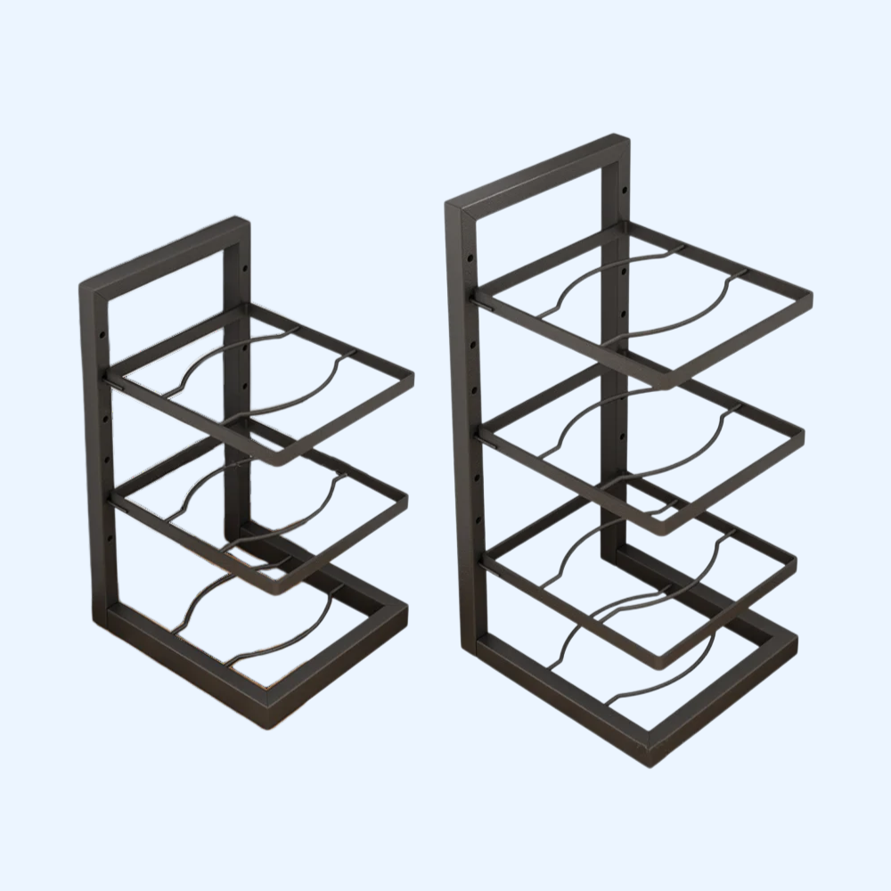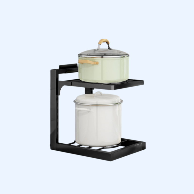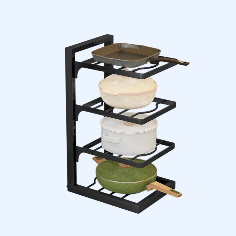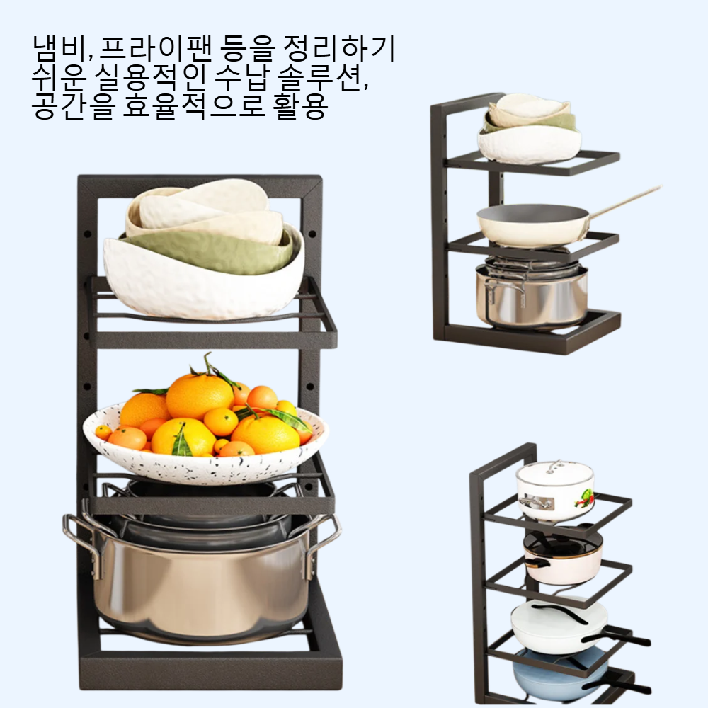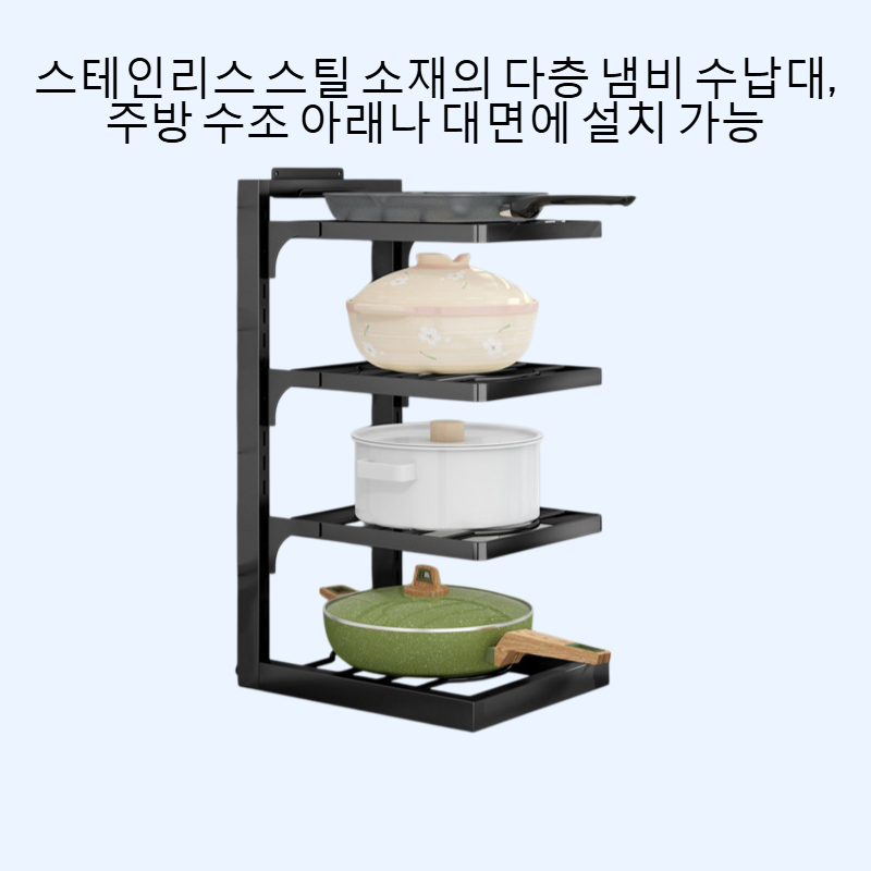 스테인리스강 소재로 내구성 우수, 다층 구조로 공간 효율적 수납, 주방 정리에 적합, 다양한 크기의 냄비 및 용기 보관 가능